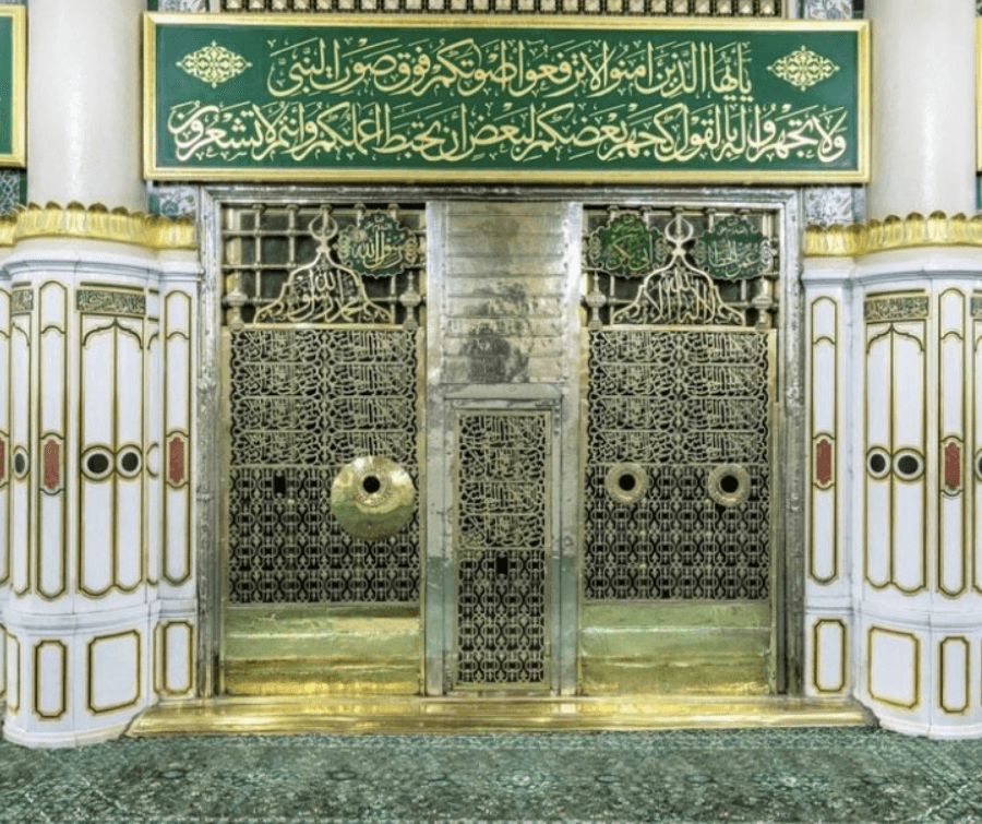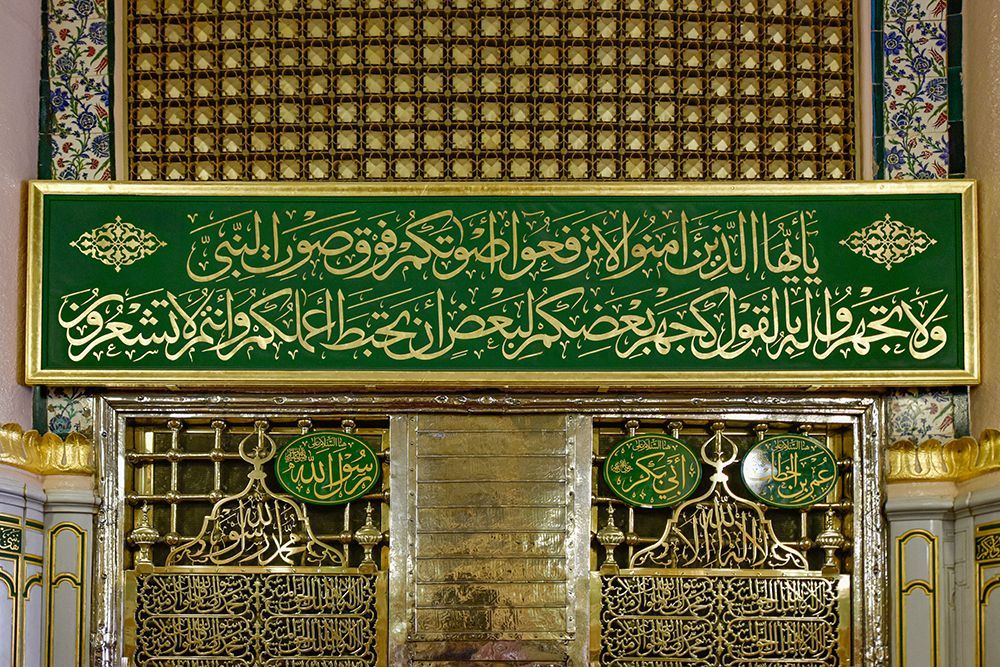 Visitors in the Prophet's Mosque find themselves standing just outside the Burial Chamber in reverence of the Prophet, immediately adjacent to his two companions, Abu Bakr and Omar.