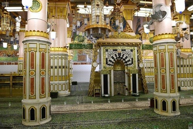 The Prophet, may God's prayers and peace be upon him, used to stand on this pulpit and lead congregations. The podium measured two cubits in length, one span, three fingers, and one full cubit width, which the later Saudi government kept an eye on, in ways of developing it through time. The goodness of the pulpit, may it be acceptable, is the statement of the Prophet, may God's prayers and peace be upon him: "Between my house and pulpit, there is one garden of Paradise."