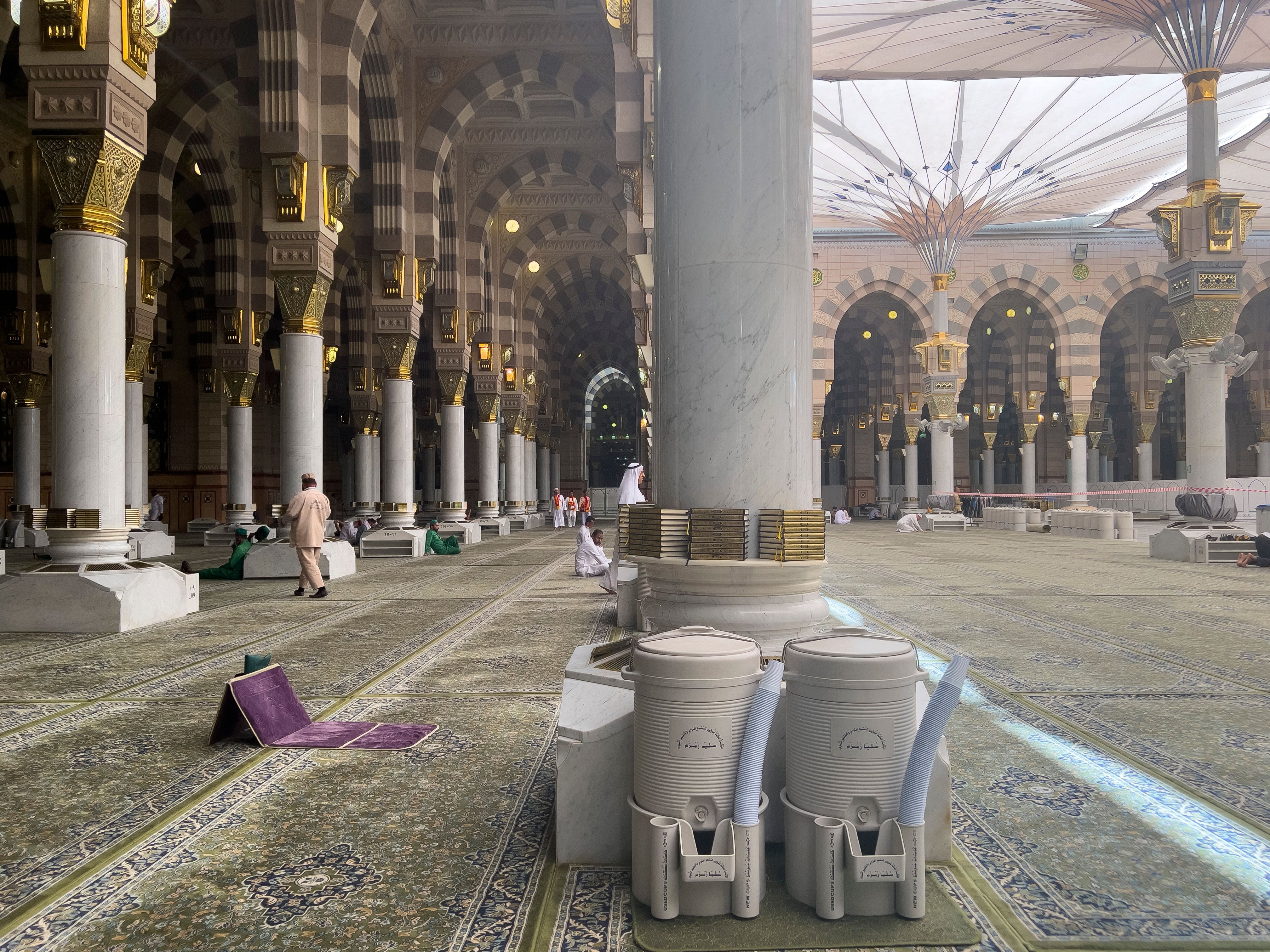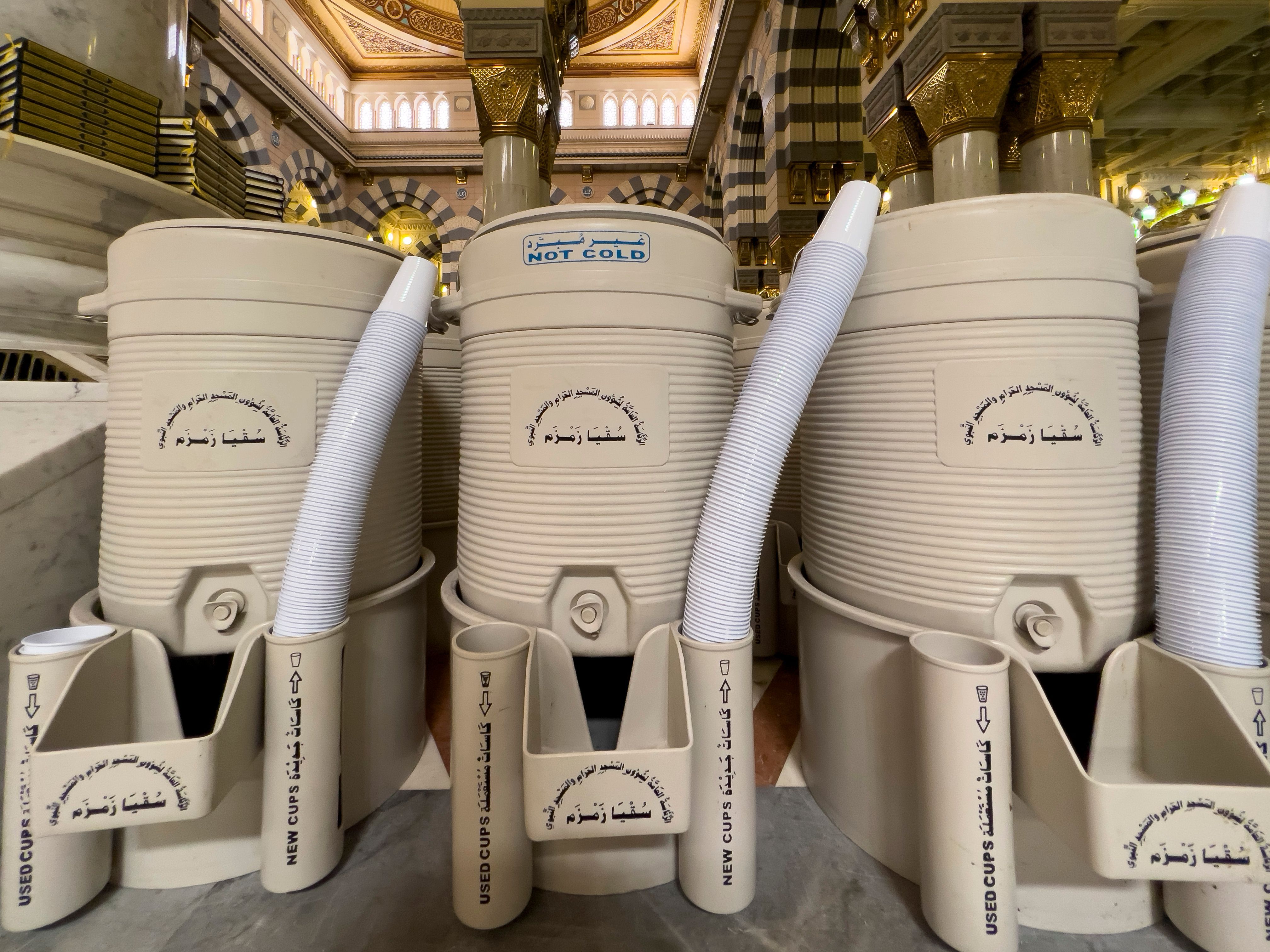 Zamzam water is the only drinking water at the Prophet's Mosque. It is supplied, under the strictest guidelines for safety and purity, to one of the Zamzam Tanks at the Prophet's Mosque from packaging stations in Madinah.