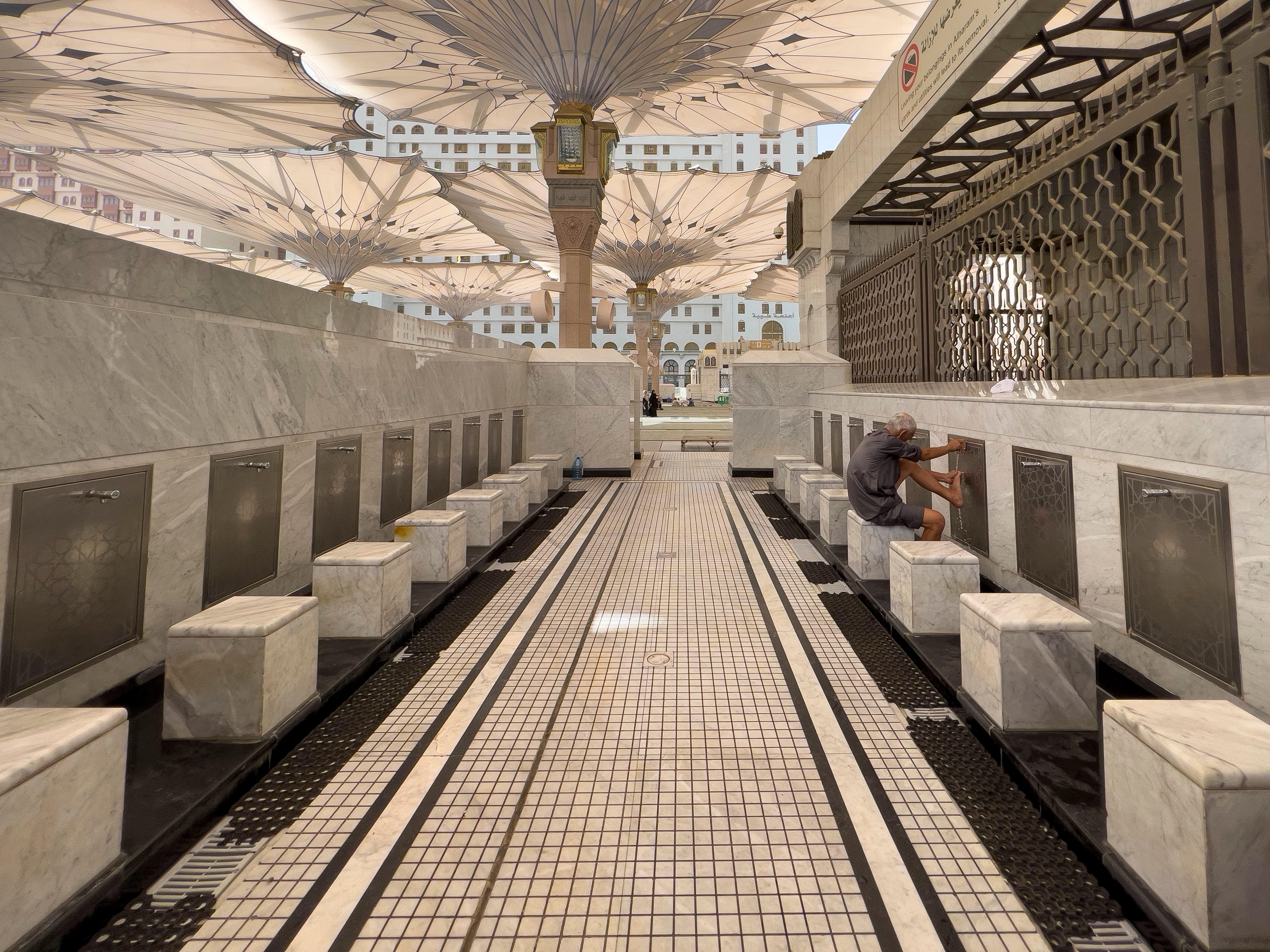 Muslims should always have access to toilets and ablution facilities for the purpose of maintaining cleanliness and performing ritual ablution. They crowd the courtyards of the Prophet's Mosque.
