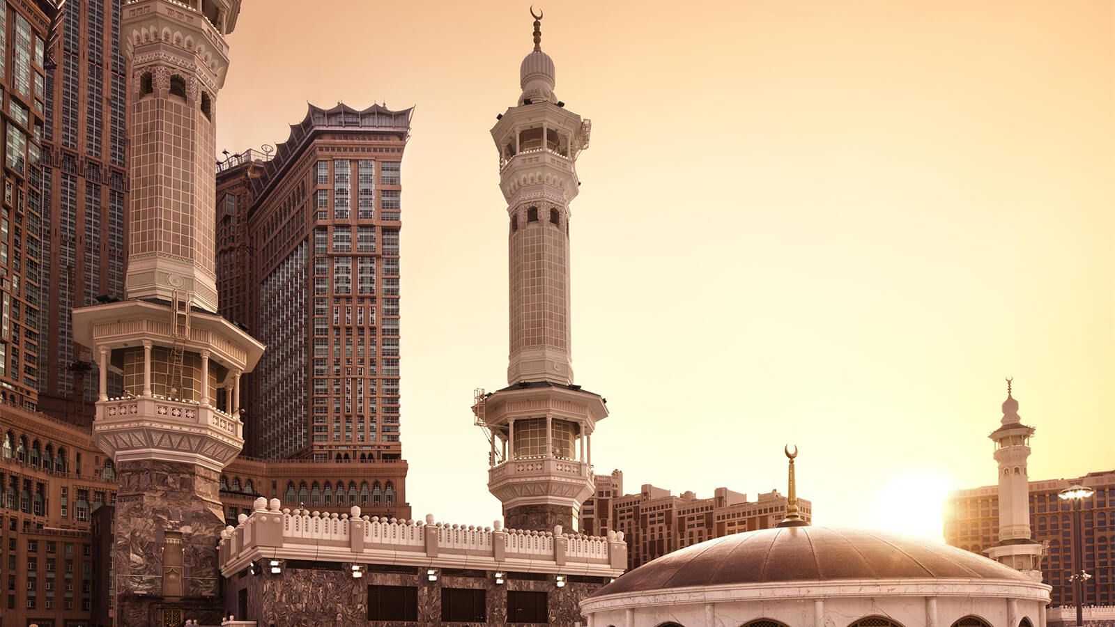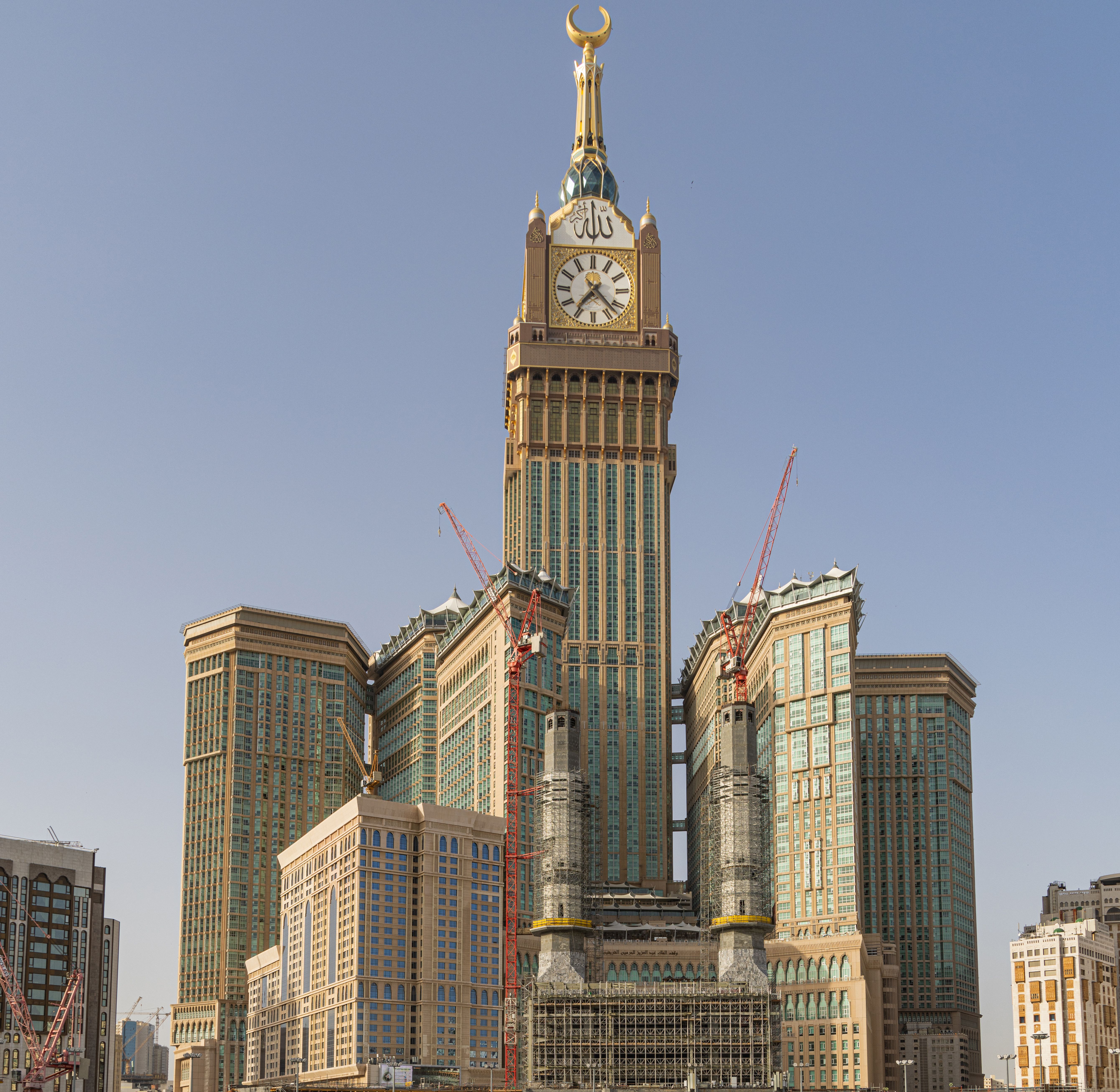 The Makkah Clock Tower rises more than 400 meters high. The biggest clock tower in the world, with a circumference of around 40 meters. The clock weighs 36,000 tons. visible from Makkah al-Mukarramah from more than eight kilometers away. The longest word in the world "Allahu Akbar" is above the clock and is over 23 meters tall. The clock has four faces and the biggest of the crescent was made with a diameter of 23 meters. The Shahadatain: "Muhammad is the Messenger and servant of Allah, Taste this and believe that there is no god except Allah" can also be seen. It was constructed in accordance with the strictest security standards in a purely Islamic style.