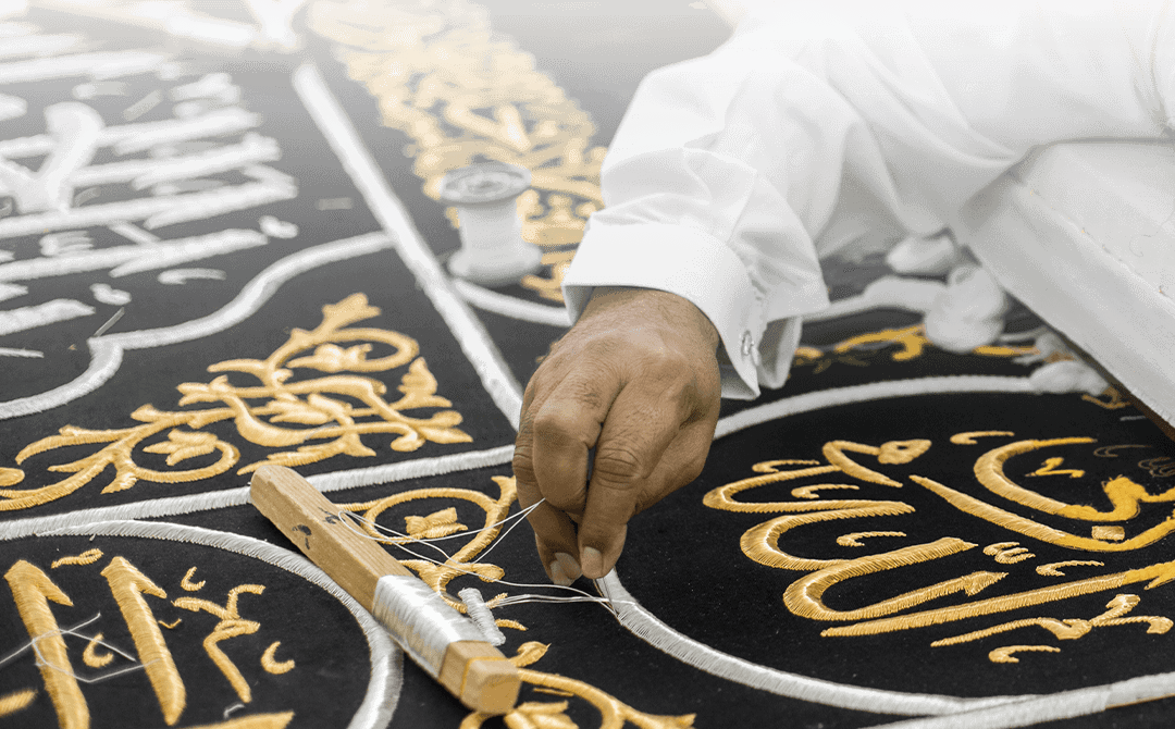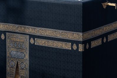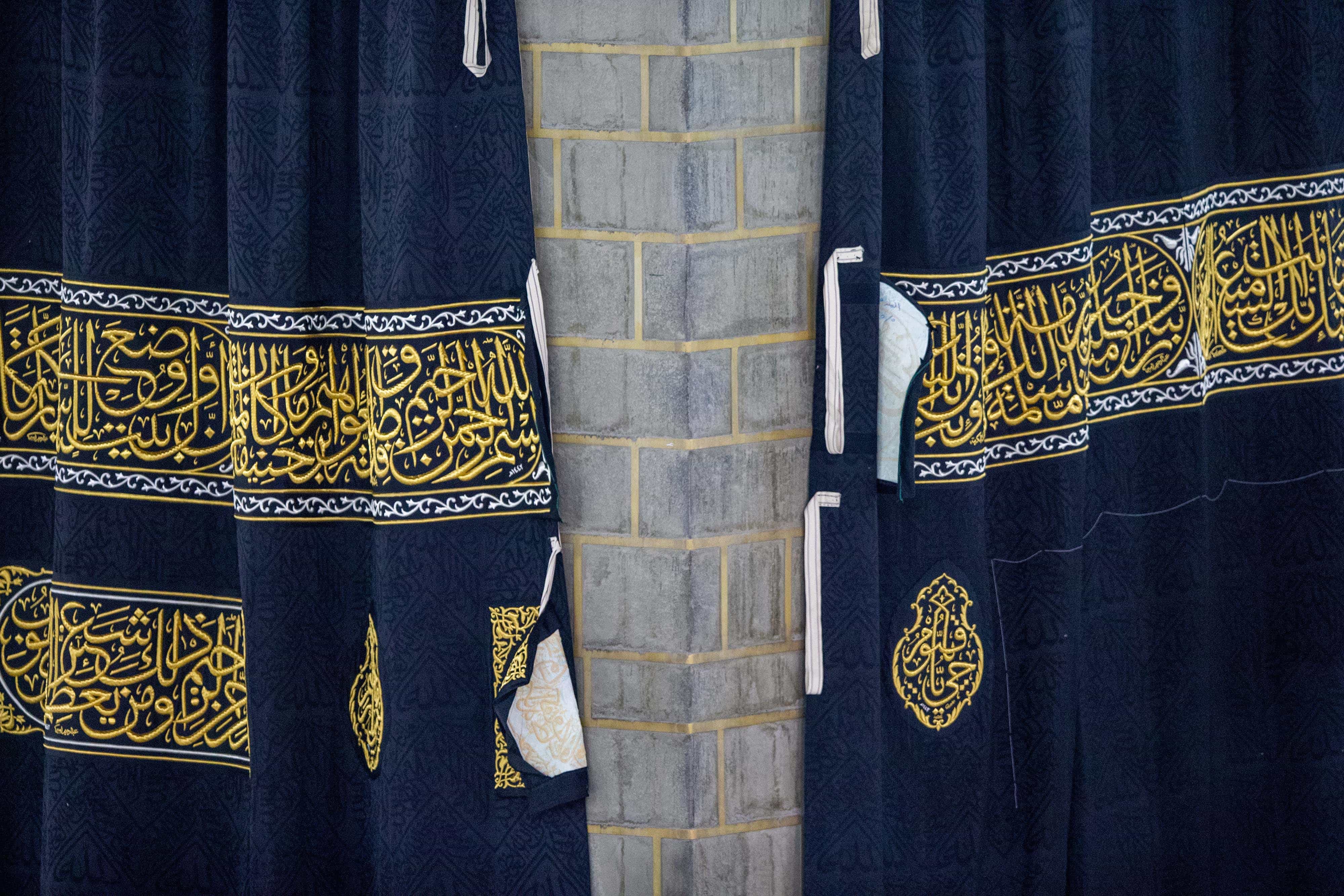 The history of the Kaaba is woven into and intricately entwined with that of Kiswah. The silk is black and embroidered with passages from the Holy Qur'an in gold water. In all, there are five pieces, the fifth being a curtain that is draped over the door of the Kaaba. Production is carried out under the direct supervision of the Kiswah Factory of the Holy Kaaba, located in the very heart of Makkah, Al-Mukarramah. The new Kiswah replaces the old one once-a-year during Hajj on the day after the pilgrims have left Arafah.